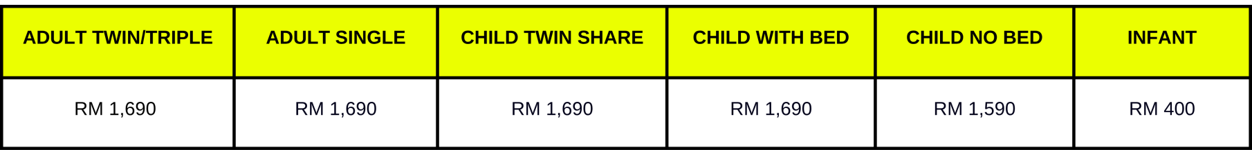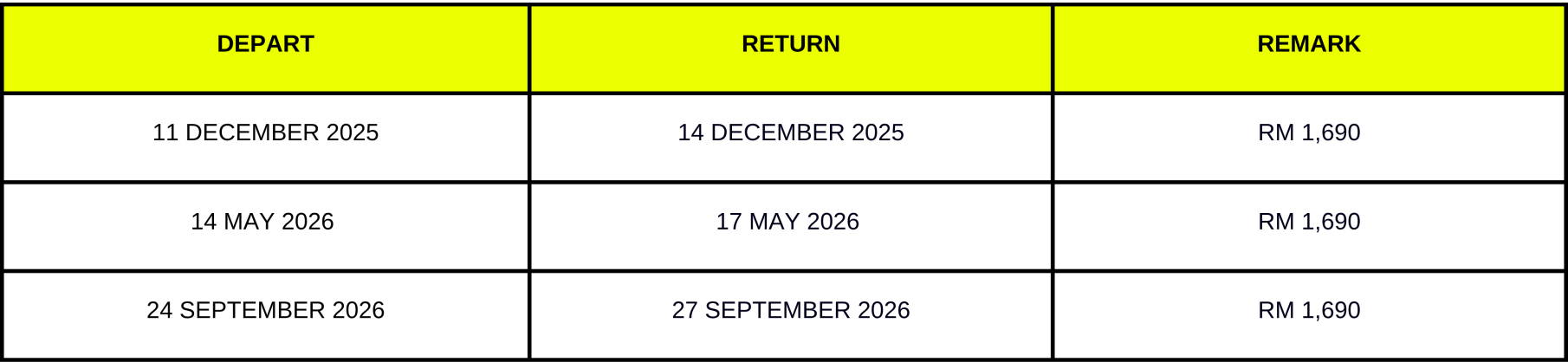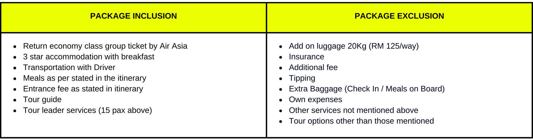 * Arrangement of hotel and itinerary is subject to change if fully booked , weather not permitted, caught in traffic jam or due to unforeseen circumstances *