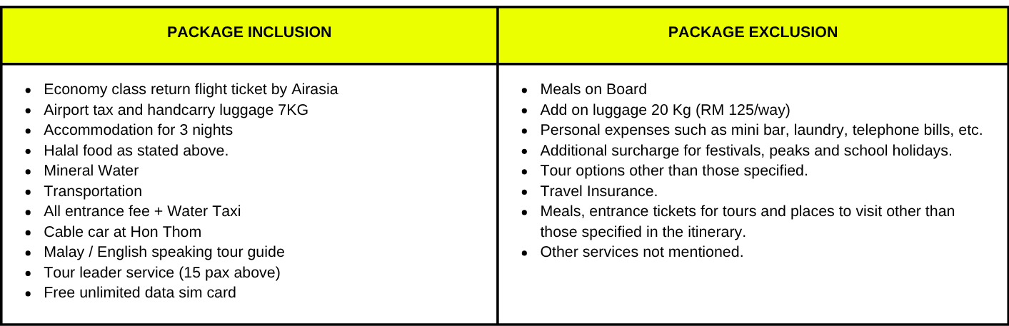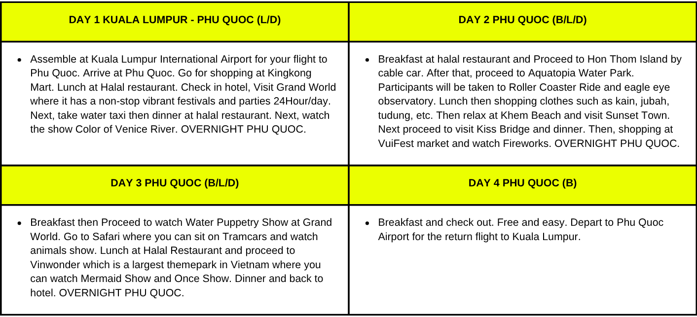 TEMPAT LAWATAN Aquatopia water parkMost exciting water parks, featuring thrilling slides Black pepper plantationFamous black pepper is grown, harvested, and processed. Grand WorldExplore this vibrant entertainment complex with colorful architecture Hon thom islandTake a scenic cable car ride to this island paradise Kiss bridgeCapture romantic moments at this stunning bridge designed Roman SquareStroll through European-inspired streets featuring Roman-style VinwonderFun theme park with exciting rides, water adventures Vin safariHome to hundreds of wildlife species living in natural habitats.ITINERARYPAKEJ 4 DAY 3 NIGHT * Arrangement of itinerary is subject to change if weather not permitted, caught in traffic jam or due to unforeseen circumstances *APA YANG TERMASUK & TAK TERMASUK DALAM PAKEJ ? HARGA PAKEJ JOM TANYA KAMI Nama: Nombor WhatsApp: Lain-lain: SUBMIT WhatsApp Kami