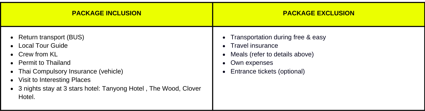 Kerisik Mosque Rim Kuen Night Market Pai Na Nara Erawadee Sweet Salt Industry Jamek Al Fathoni Mosque Heng Kitchenware Peanut FactoryITINERARYPAKEJ 5 DAY 3 NIGHT * Arrangement of itinerary is subject to change if weather not permitted, caught in traffic jam or due to unforeseen circumstances *APA YANG TERMASUK & TAK TERMASUK DALAM PAKEJ ? HARGA PAKEJ JOM TANYA KAMI Nama: Nombor WhatsApp: Lain-lain: SUBMIT WhatsApp Kami